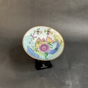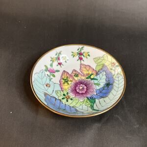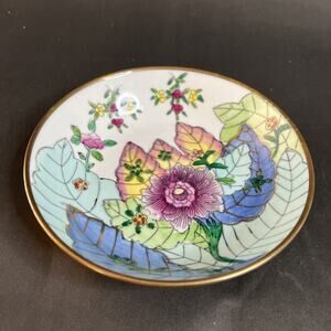 This vintage Chinese porcelain bowl features a delicate hand-painted floral design encased in a brass footed base, blending elegance with traditional craftsmanship. The bowl’s soft color palette and botanical motif evoke classic Asian export ware, while the patinated brass stand adds warmth and vintage charm.