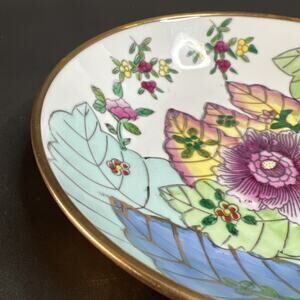chinese bowl, brass base, floral decor, hand painted, asian wall art, porcelain dish, vintage china, export ware, wall hanging bowl, botanical art, midcentury decor, oriental style, collectible bowl