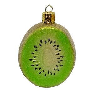 * Vintage Christborn Germany hand blown glass kiwi ornament, featuring a detailed half-cut realistic kiwi design. The sugared finish sparkles beautifully under light and makes a standout piece for any culinary-themed tree, wreath, or display.