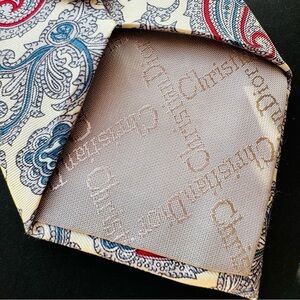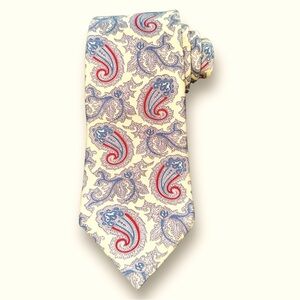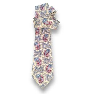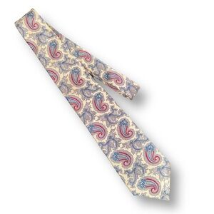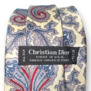 VTG Christian Dior Pale Lemon Silk Tie Made in U.S.A. Red & Blue Paisley Outline