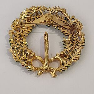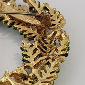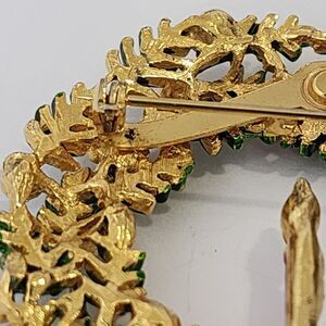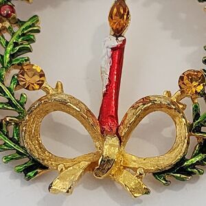 VTG Christmas Brooch Pin Wreath Candle Festive Red Green Gold Tone Rhinestones