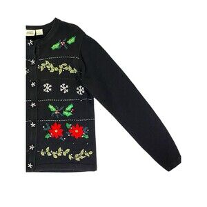 Get into the holiday spirit with this vintage Christmas cardigan sweater from Jason Maxwell in a size medium. Featuring a festive Christmas theme with beaded and embroidered accents, this sweater is perfect for any occasion, whether it's a casual outing, a party, or even travel. The tight-knit ramie/cotton material is soft and comfortable, and the classic sleeve type and round neckline add a touch of elegance to this retro-inspired sweater.