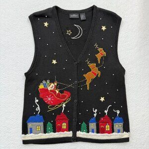 VTG Christmas Flying Santa Reindeer Sky Sweater Vest Black Grandma Teacher Sz L