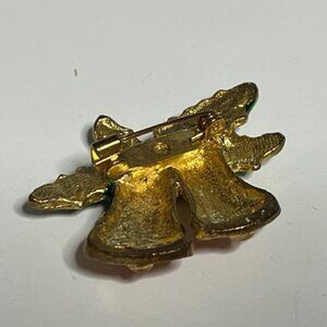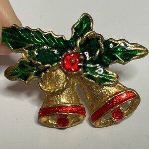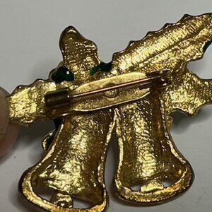 VTG Christmas Holiday Bells Gold Tone Enamel Bow Holly Berries Brooch Pin 1.5"x1