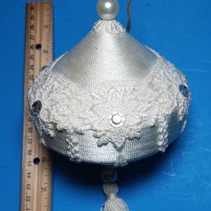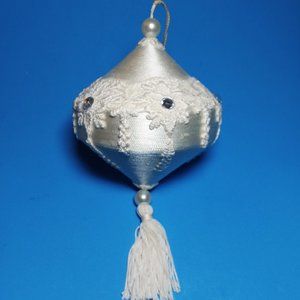 VTG Christmas Ornament White Eyelet Lace Tassel Tree Rhinestone Pearls Shabby