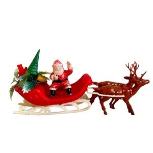 Vintage Christmas Santa and Sleigh with Deer Plastic Holiday Decor Made in Hong Kong