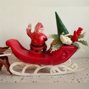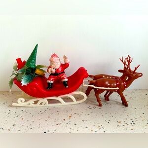 Vintage Christmas Santa and Sleigh with Deer Plastic Holiday Decor Made in Hong Kong