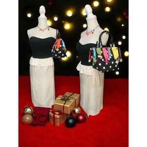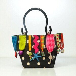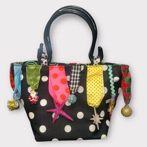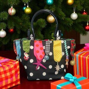 This vintage, handmade tote bag features a playful polka dot design complemented by colorful ornament tassels, creating a festive and eye-catching accessory. Made in the early 1990's, It's designed with a top handle for ease of carrying, and its spacious interior ensures practicality during holiday outings. This bag juxtaposes vibrant colors with subtle kitschy fun, making it a must-have for the season.
