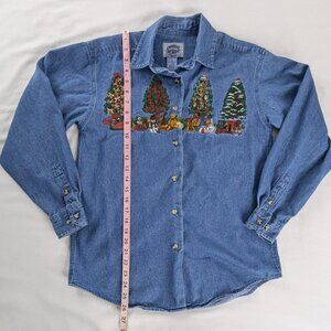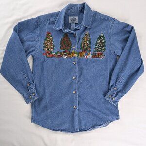VTG Christmas Tree Embroidered Button Up Long Sleeve Denim Shirt