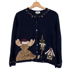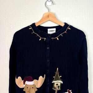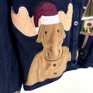 Long sleeve navy blue cardigan with embroidered christmas lights and birdhouses and moose in a Santa hat. Shoulder pads. Ramie/Cotton blend.