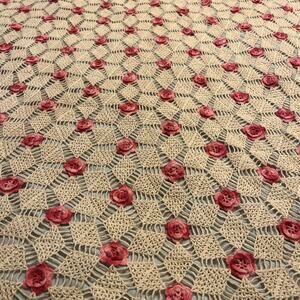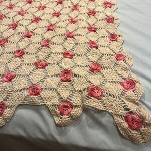 VTG Chrochet Knit Lap Blanket Coverlet 3D Flowers Scalloped Granny Cottage