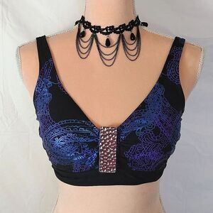 - TOP also has a shiny silver textured hardware decor. Built in pads, side boning, adjustable shoulder straps & back strap has an adjustable slide closure.