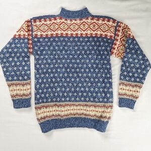 VTG Chunky Knit Fair Isle Wool Blend Blue Cream Red High Neck Sweater