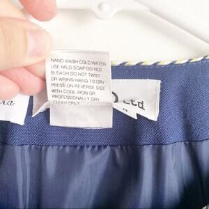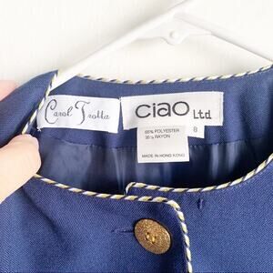 Vintage VTG Dress Ciao LTD Carol Trotta Navy Blue Short Sleeve Button Up Gold Buttons Piping Size 8 {Eight}. White, gold, navy piping. Functional buttons. Pockets. Polyester/rayon. Shoulder pads. Hand wash. Brand: Carol Trotta Ciao Ltd. Lined. Flight attendant secretary style. Please see measurements as vintage sizing can differ from modern sizing. Good, preowned, vintage condition. Model photo is AI generated. Please see measurements below to ensure fit on your body type.