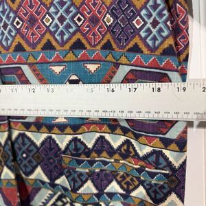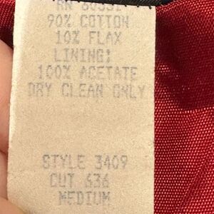 Authentic vintage Circle T woven tapestry blazer with bold Southwestern geometric pattern in deep red, cream, teal, and indigo tones. Single-breasted with notched lapels and subtle shoulder pads. Lined in smooth acetate for easy layering. Tag size Medium. Fabric is a heavyweight woven cotton/flax blend with a cozy structured feel.