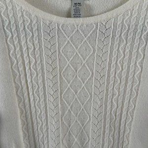 I lovingly call this sweater a Grandma sweater but it is a beautiful sweater with elegant details. Dainty pearls decorate the front middle with pretty detailing down the arms each sleeve. Great condition!