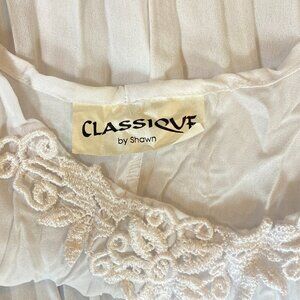 Description: VTG Classique by Shawn Ivory Sheer Crinkle Pleated Crochet Hem Maxi Dress. Gorgeous vintage Classique by Shawn semi-sheer ivory crinkle pleated maxi dress, crochet at the bust and hem. Would be cute as a swimsuit cover-up also or wear it with a slip and a belt and straw tote or dress it up with some heeled sandals.