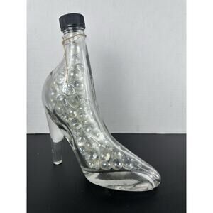 The product is a vintage clear glass stiletto slipper shaped liquor bottle with a cap. This unique and collectible item would make a great addition to any bar or decor. The clear glass design allows the contents to be easily seen, making it a stylish and functional piece for any collector of liquor bottles.
