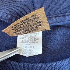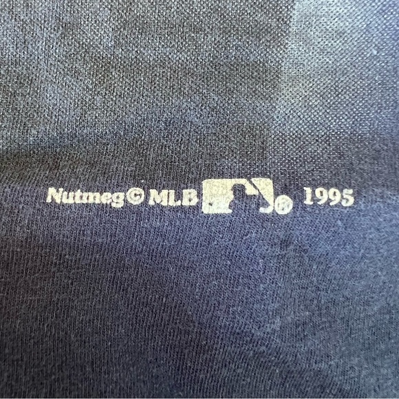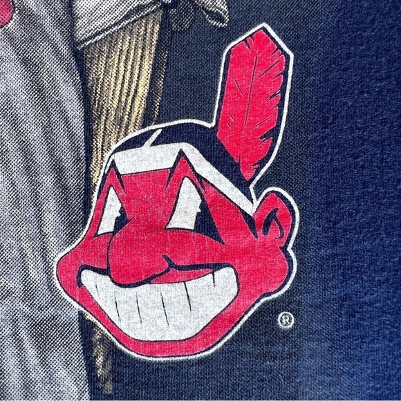 Vintage 90’s 1995 Nutmeg Mills Cleveland Indians (Guardians) Short Sleeve T-Shirt. Nutmeg tag, made in USA. Dark Blue with Gold embroidered Cleveland Indians accent. Graphic shows two classic jerseys and the old logo. Good condition with minor wash wear and some cracking on the graphic. The left sleeve has a small hole.