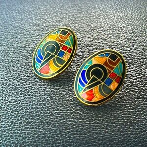 VTG Cloisonné Abstract Art Earrings Pierced Ear Posts Multicolored Stained Glass