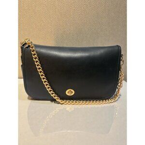 • Exterior: Black glove-tanned leather, NWT Coach detachable shoulder chain strap (No. CR457, MSRP: $50) and Brass turn-lock flap closure; slip pocket under flap; Original hang tag included