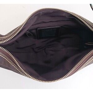 The VTG Coach Y2K Brown Leather Hobo Crescent Contrast Stitch 10574 is a stylish and vintage women's handbag from Coach. Featuring a unique crescent shape and stitching accents, this medium-sized hobo bag is made of smooth brown leather with a fabric lining. The shoulder strap handle in brown leather complements the silver buckle hardware accents, giving it a chic and trendy Y2K look. This handbag also includes inner pockets, an adjustable strap, and comes with a bag charm and dust bag, making it a practical and fashionable accessory for any outfit. 12" across the top 8" at the bottom 6" height. Excellent pre owned condition, no stains rips or odors.