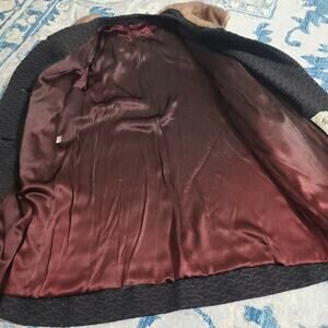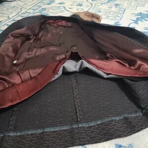 Heavy jacquard textured fabric gray coat with burgundy lining & light brown fur trim.