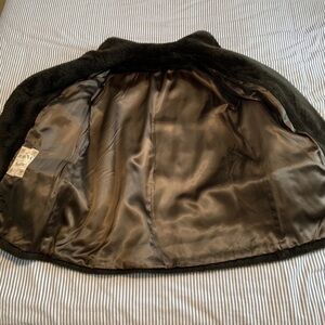 Some wear shown in the inside lining and pocket lining. Outside faux fur in good shape. Good condition for its age.