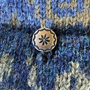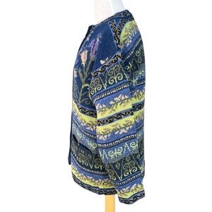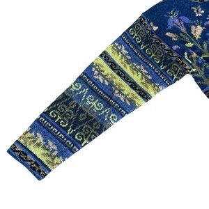 Vintage Coldwater Creek Icelandic Design Wool Knit Cardigan Sweater. Women’s size small. 100% Shetland wool in a beautiful Nordic fair isle design with flowers. Blue, Green, Pink and Purple. Decorative buttons, two patch pockets at front. Stylish with a substantial feel.