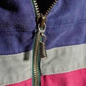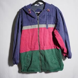 VTG Color Block Canvas Jacket Mens M Blue Red Green Full Zip Hood Retro 80s 90s