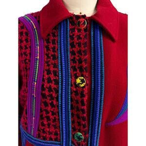 This VTG Coloratura 100% wool coat is an extraordinary statement piece of art-to-wear fashion. Bold red wool is accented with appliqué patches, handwork-style trim, and whimsical color-block motifs. What you’ll love about this piece is its vibrant energy — it feels both playful and gallery-worthy.