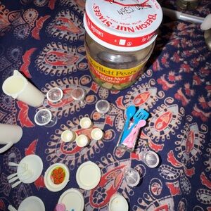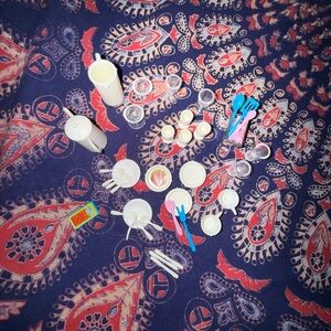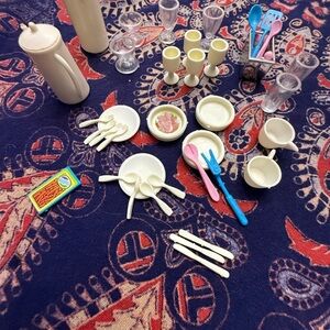 VTG Charming dollhouse kitchen set with colorful utensils and dishes. Includes cream plates, cups, and a pitcher. Features pink and blue cutlery.