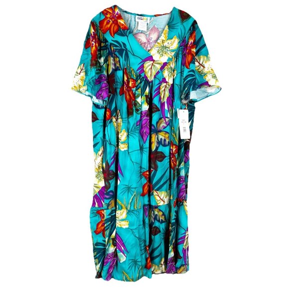 VTG Colors 1X Bold Hawaiiian Dress Large Print Floral 100% Rayon Mumu 44"L NWT