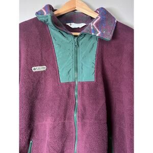 Upgrade your outdoor wardrobe with this authentic vintage 90s Columbia Sportswear fleece jacket, made in the USA. This rare piece features classic purple fleece, a teal nylon chest panel, and the signature Southwest/Aztec trim on the collar—an iconic look from Columbia’s early outdoor collections.