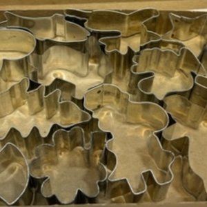 Vintage boxed set of 12 all- occasion metal cookie cutters featuring fish, turkey, dog, ax, cross, angel, heart, star, reindeer, clover, rabbit, Santa.