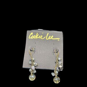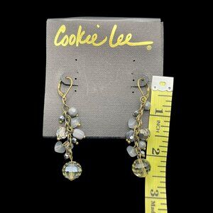 VTG Cookie Lee Earrings Gold Tone Hook Dangle Beads Light Gray Bead