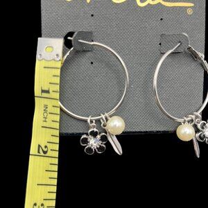 VTG Cookie Lee Earrings Silver Tone Hoops Removeable Charms Flower Feather Pearl