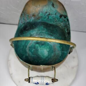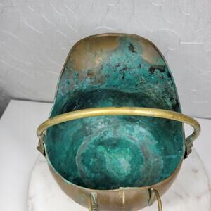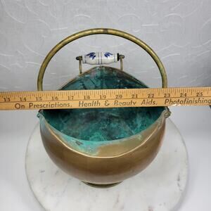 VTG Copper Coal Scuttle Ash Bucket 11" Patina Lion Head Delft Porcelain Handle