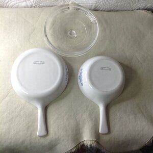 VTG Corning Ware Cornflower Blue Cookware; 3 pcs. Classic, Traditional, Retro Vibes, (1) 6.5" diameter, 1.5" deep, (2) 6" Diameter, 2" Deep with one top. Old is cool, They don't make them like they used to. VERY Gently Pre-loved; no visible signs of wear.