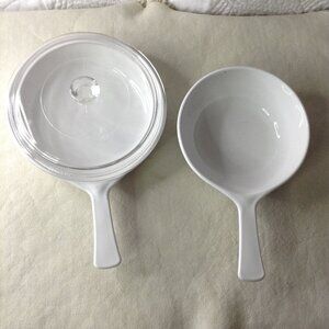 VTG Corning Ware Cornflower Blue Cookware; 3 pcs. Classic, Traditional, Retro Vibes, (1) 6.5" diameter, 1.5" deep, (2) 6" Diameter, 2" Deep with one top. Old is cool, They don't make them like they used to. VERY Gently Pre-loved; no visible signs of wear.