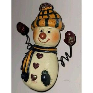 VTG Country Snowman Christmas Brooch Pin Metal Spring Wire Arms Clay Look