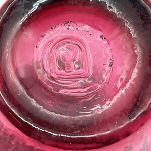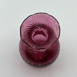 Vintage Cranberry Glass Vase by Pilgrim with Bedford ruffled top and applied swirled glass, measuring 4.5 inches in height. Hand-blown in North America in the mid 20th century, this decorative piece showcases a glossy finish and a 3D effect, adding a touch of vintage charm to any space. The Cranberry glass vase is a unique and original piece that is sure to stand out in any collection of decorative pottery and glassware.