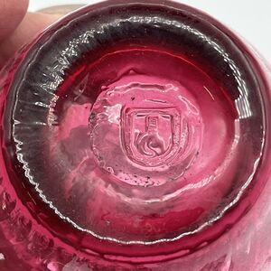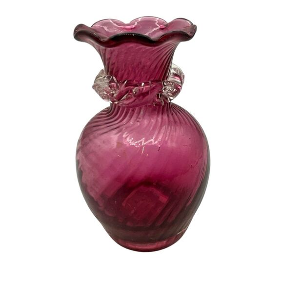Vintage Cranberry Glass Vase by Pilgrim with Bedford ruffled top and applied swirled glass, measuring 4.5 inches in height. Hand-blown in North America in the mid 20th century, this decorative piece showcases a glossy finish and a 3D effect, adding a touch of vintage charm to any space. The Cranberry glass vase is a unique and original piece that is sure to stand out in any collection of decorative pottery and glassware.