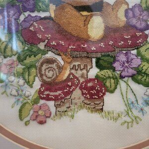 VTG Crewel Needlework Framed 17 x 17" Bear in Honeybee costume mushrooms Floral