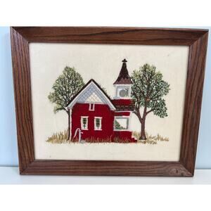 VTG Crewel Schoolhouse Wall Art Framed Needlework for Fall Teacher Gift Cottage