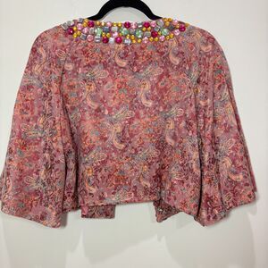 Vintage Cristina Pink Paisley Jacquard Bolero Jacket. Flared sleeves. Jeweled collar. Cropped fit. Fully lined.