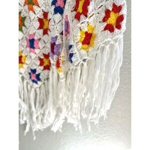 The VTG Crocheted Afghan Granny Square Fringed Wrap Scarf Shrug Cape Shawl Poncho is a versatile and stylish piece perfect for various occasions. This open-knit poncho features a multicolor design with crochet accents, giving it a unique and bohemian look. With a sleeveless and collarless design, it offers a casual and comfortable fit for women who appreciate a hippie or grandma style. Machine washable and one size fits all, this vintage-inspired piece is a timeless addition to any wardrobe.