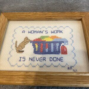 VTG Cross Stitch A Woman’s Work Is Never Done Cat Laundry Framed Picture 6 x 8”