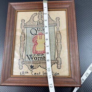 Hand-stitched embroidery art depicting "The Quiet Woman" with intricate detail, encased in a sturdy wooden frame, ideal for decorative or collectible purposes.