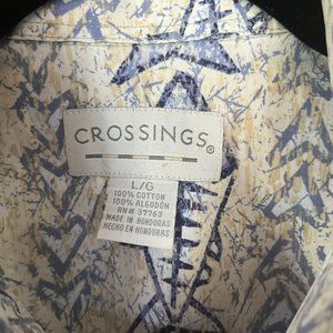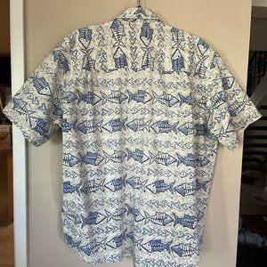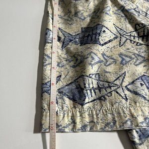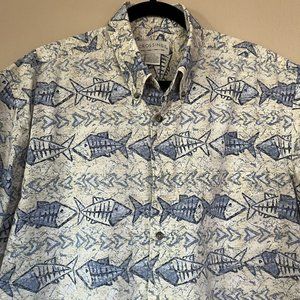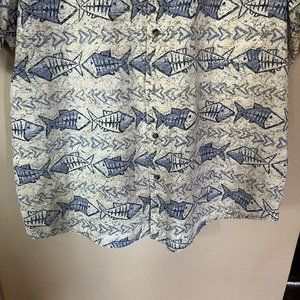 VTG Crossings Mens Fish Geometric Print Hawaiian Short Sleeve Button Down Shirt. Fits very well. Size: L. Color is Ivory/Light blue fishes pattern. Short Sleeve, Button Front. Good condition, no rips or discolorations.